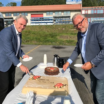 Oppstarten ble feiret med kake. Her avbildet Trond Myhre, markedsdirektør i VKT, og Glenn Rudi Baan, områdeleder Tide Buss Vestfold.